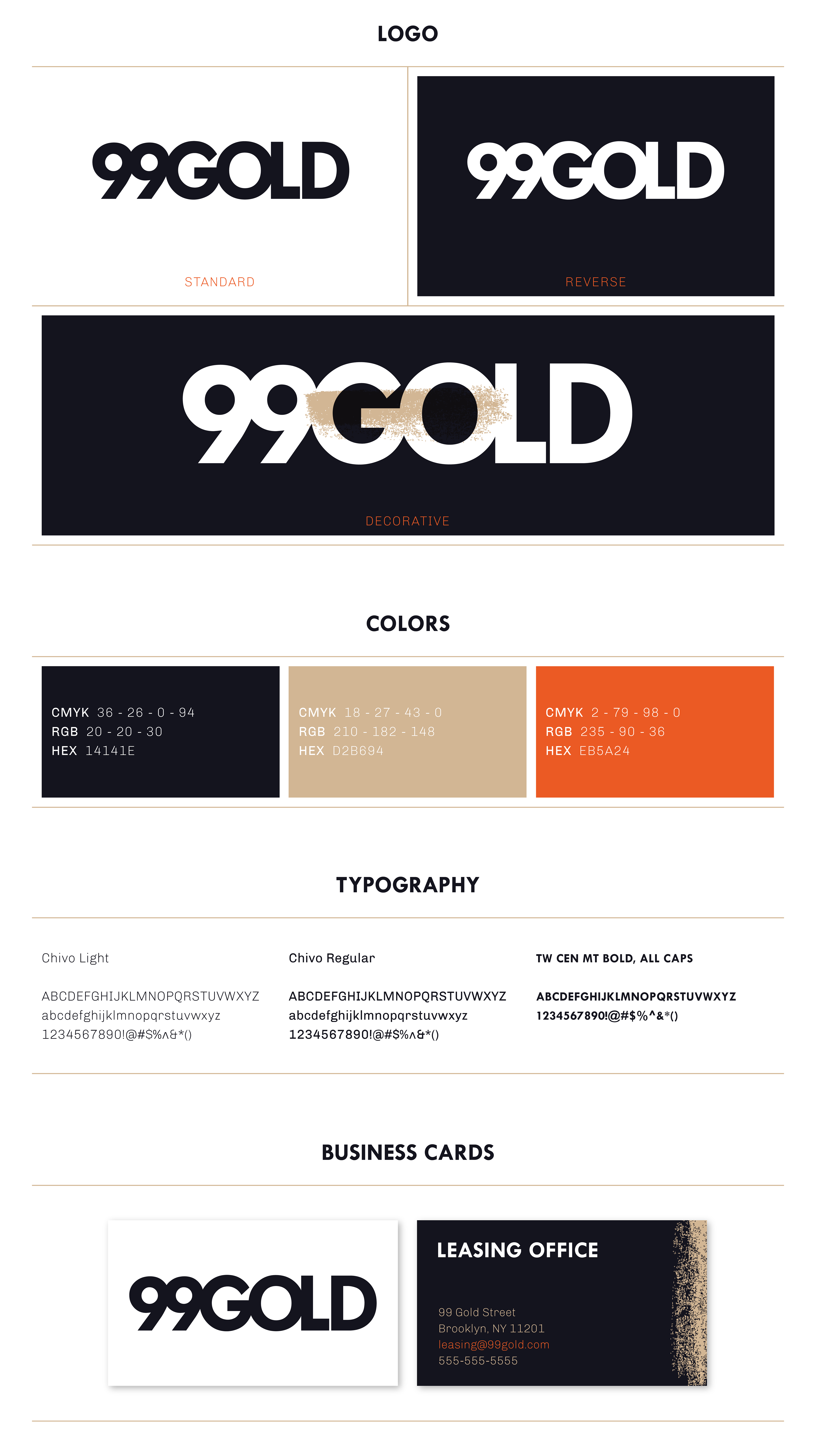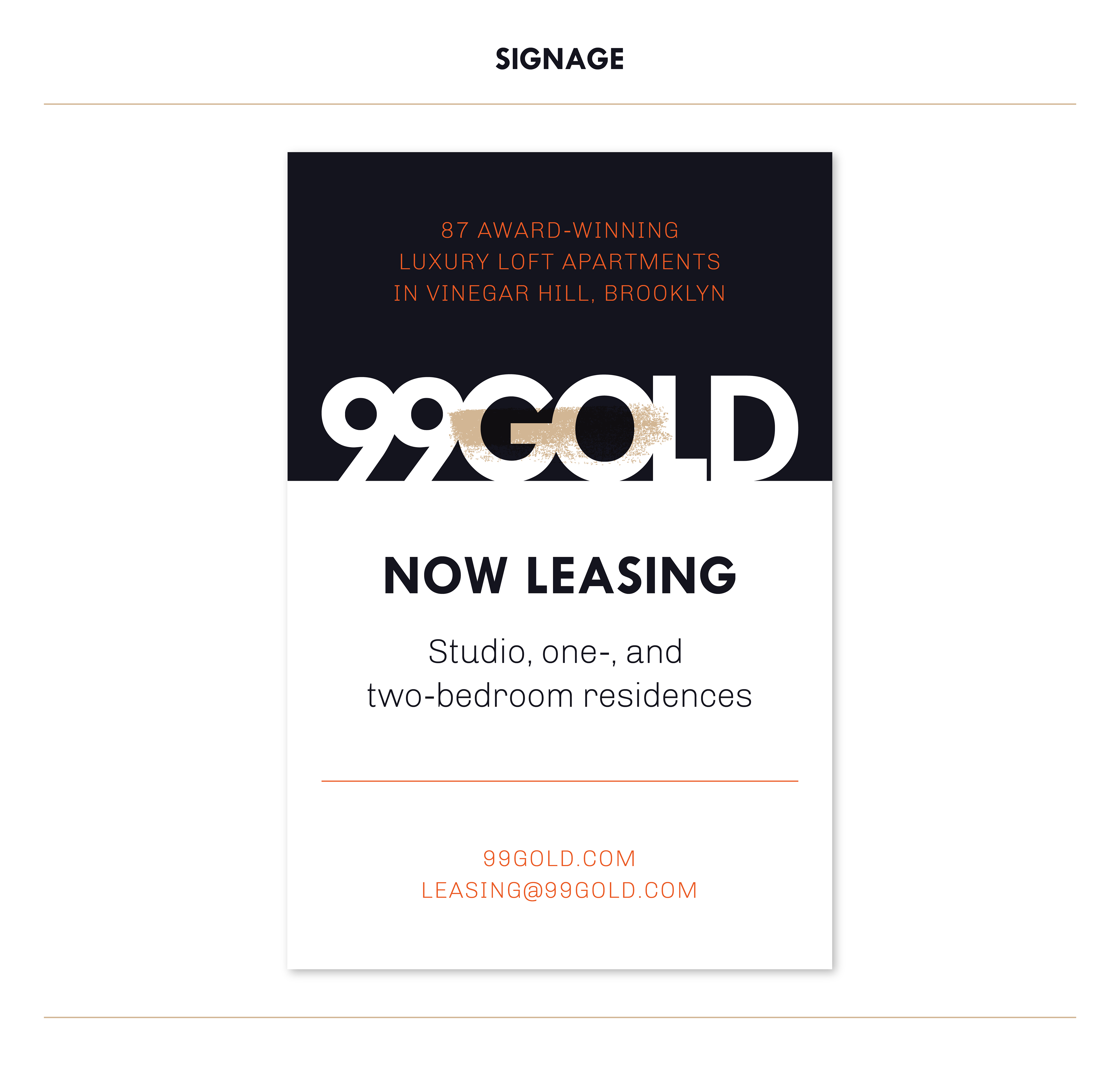 99 Gold Street is a luxury loft apartment building located in Vinegar Hill, Brooklyn. The brand is inspired by a combination of the borough's vibrant culture and the upscale lifestyle the building offers its residents.