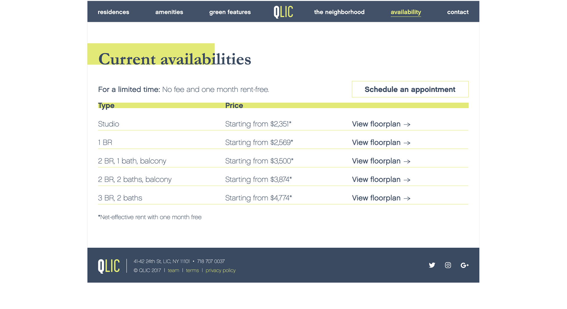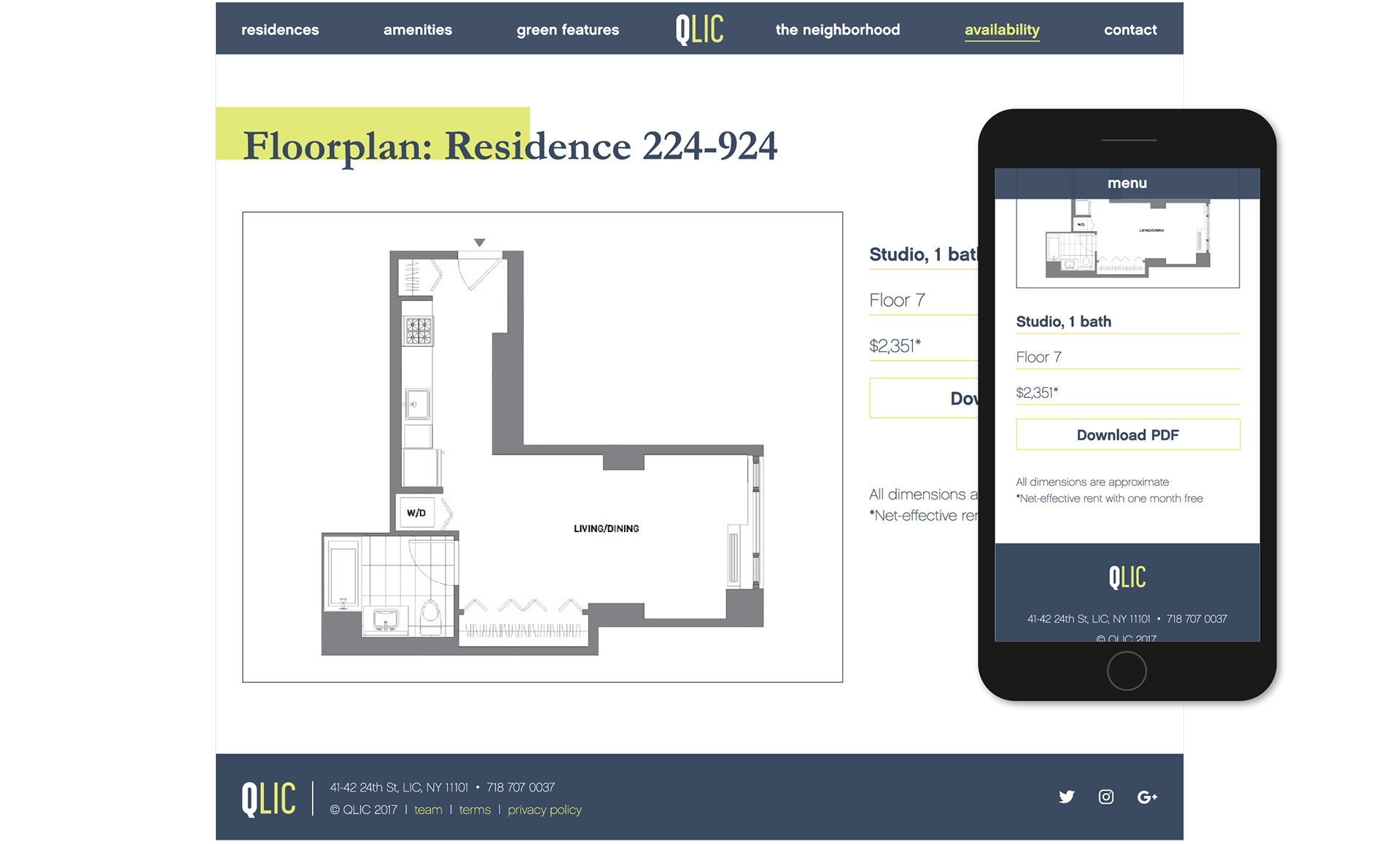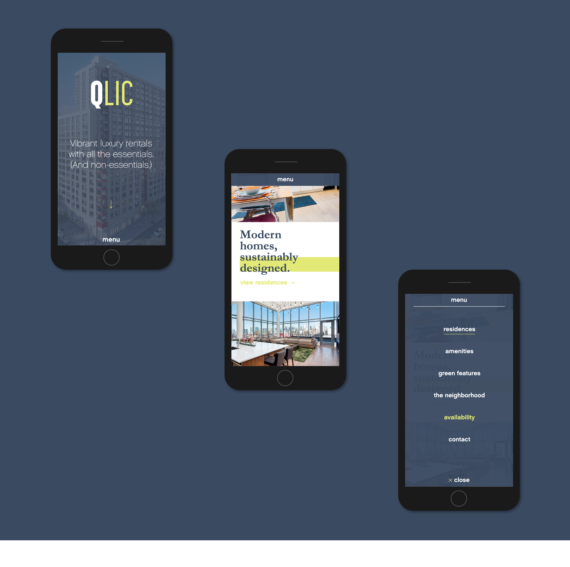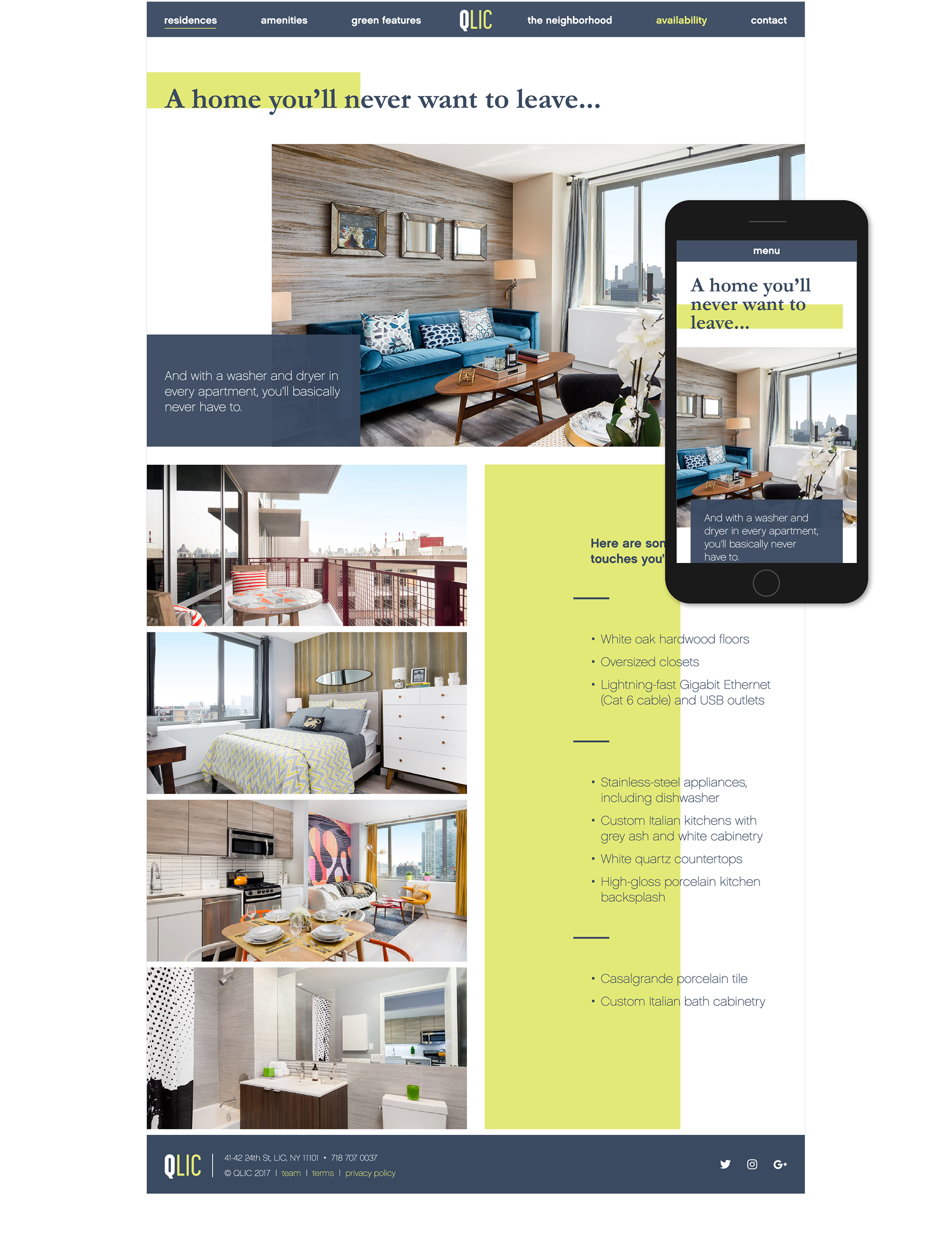 QLIC is a luxury apartment building in Long Island City, Queens. The branding and website are meant to reflect the building's bright, contemporary feel.