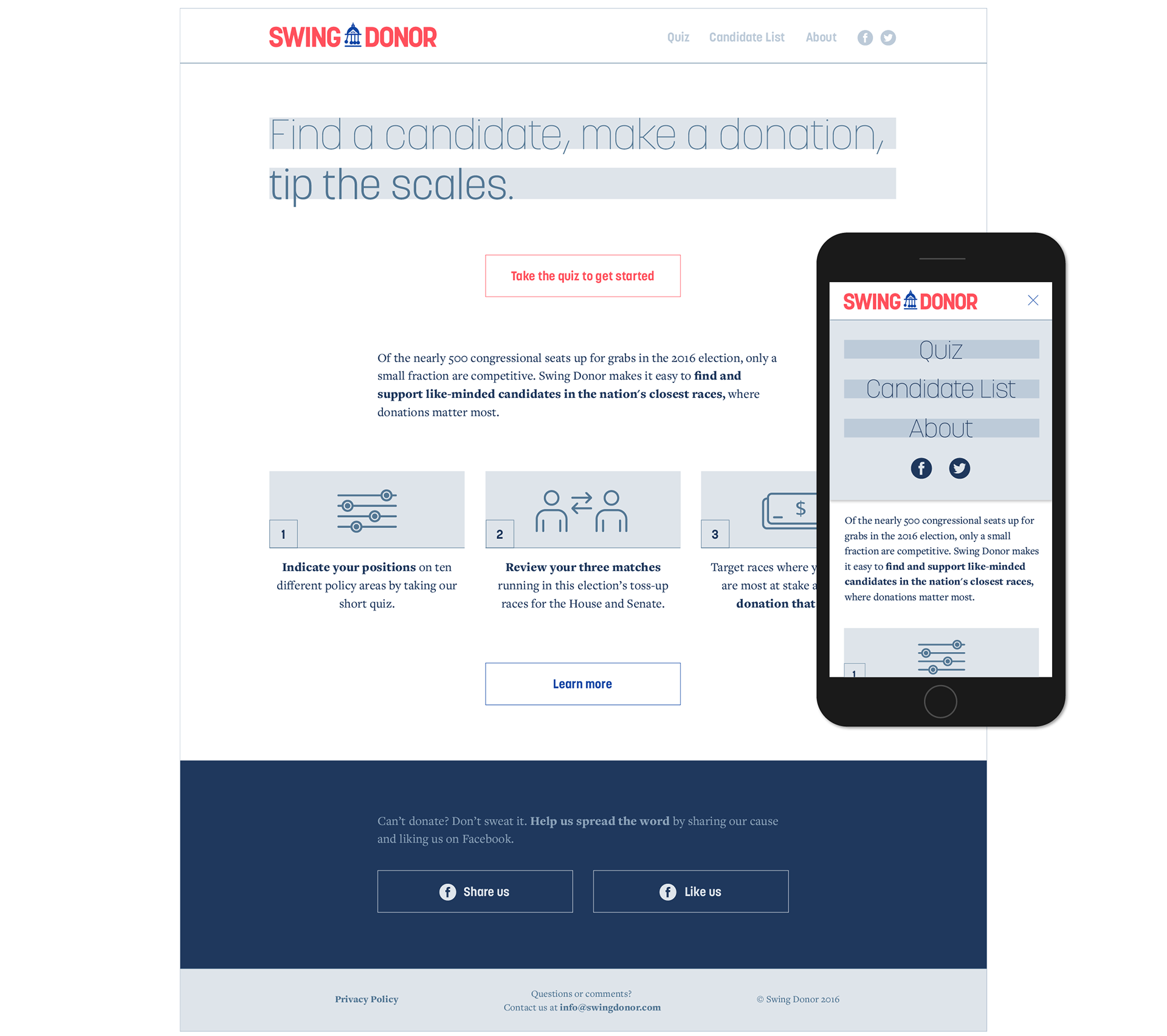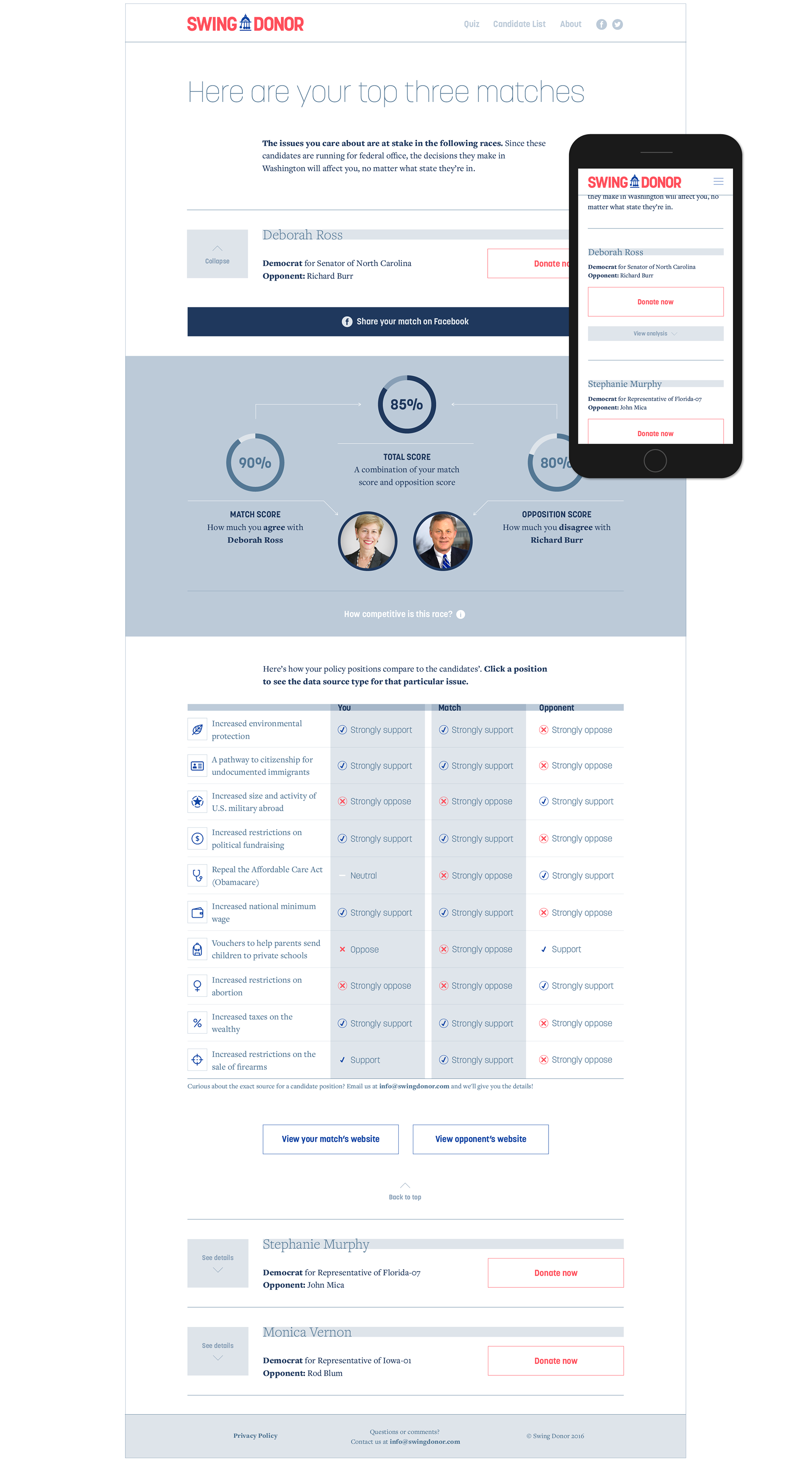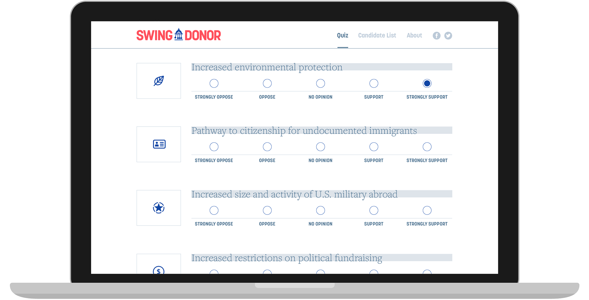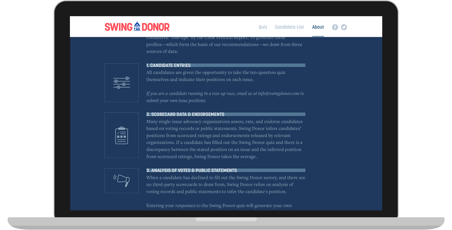 Swing Donor is a non-partisan website that matches users with congressional candidates running the nation's tightest races, where donations matter most.